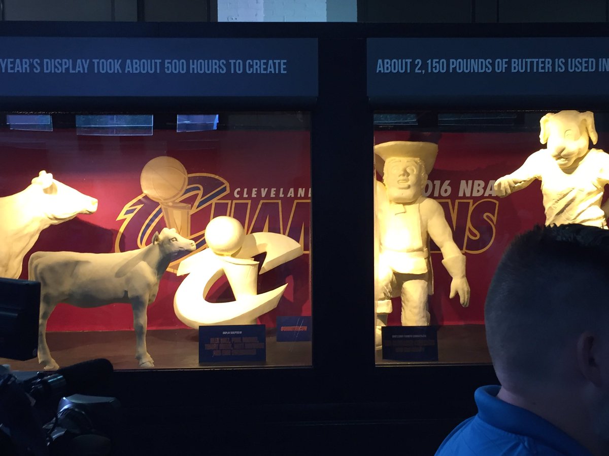 27.07.2016На одной из крупнейших ярмарок в США, Ohio State Fair в Коламбусе, решили поздравить "Кливленд" с победой в чемпионате НБА, отлив из масла чемпионский трофей, логотип "Кавалерс" и маскота команды.